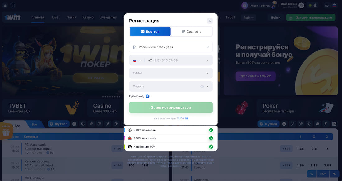 Для начала игры в букмекерской конторе 1win требуется зарегистрироваться для того чтобы играть на реальные деньги. Создание учетной записи также открывает возможность к получению бонусов на первые четыре депозита и другим акционным предложениям компании.